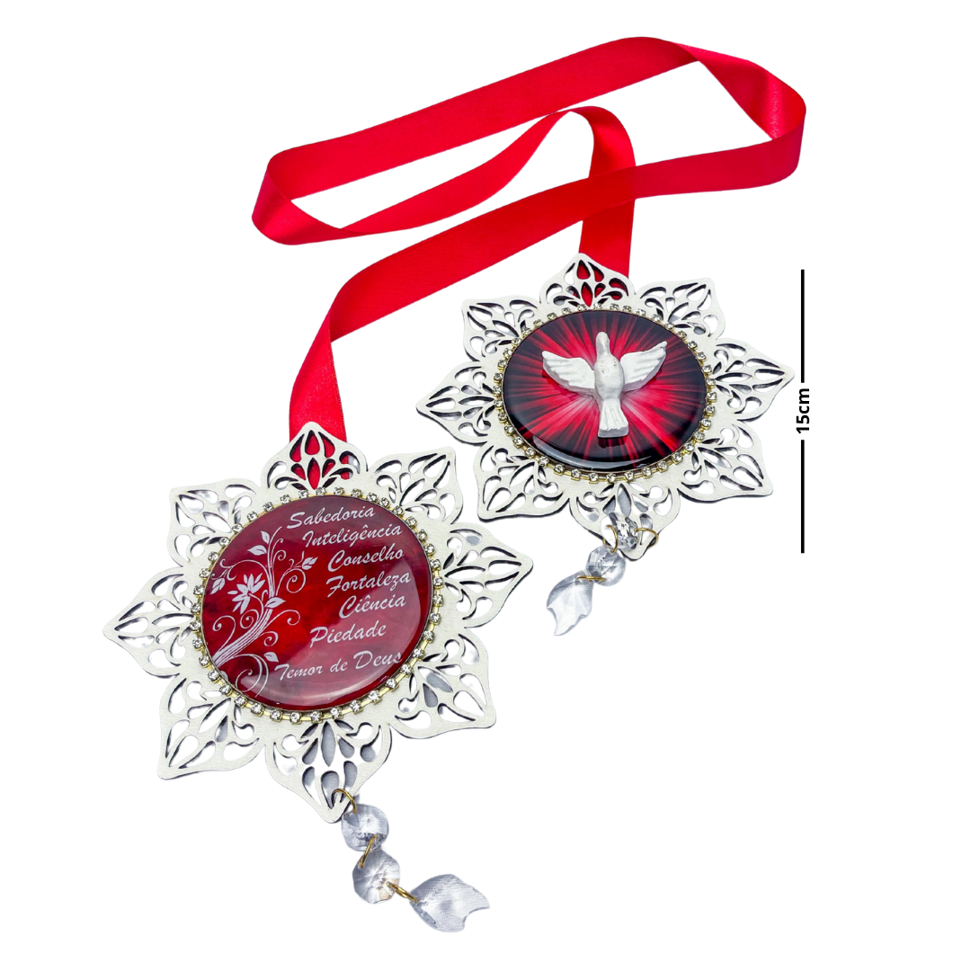 Esse escapulário de porta é um verdadeiro sacramental de beleza e poder espiritual. Com design elegante em MDF, acabamento resinado brilhante, aplicação de strass e delicados cristais pendurados, ele representa os 7 dons do Espírito Santo: Sabedoria, Inteligência, Conselho, Fortaleza, Ciência, Piedade e Temor de Deus.