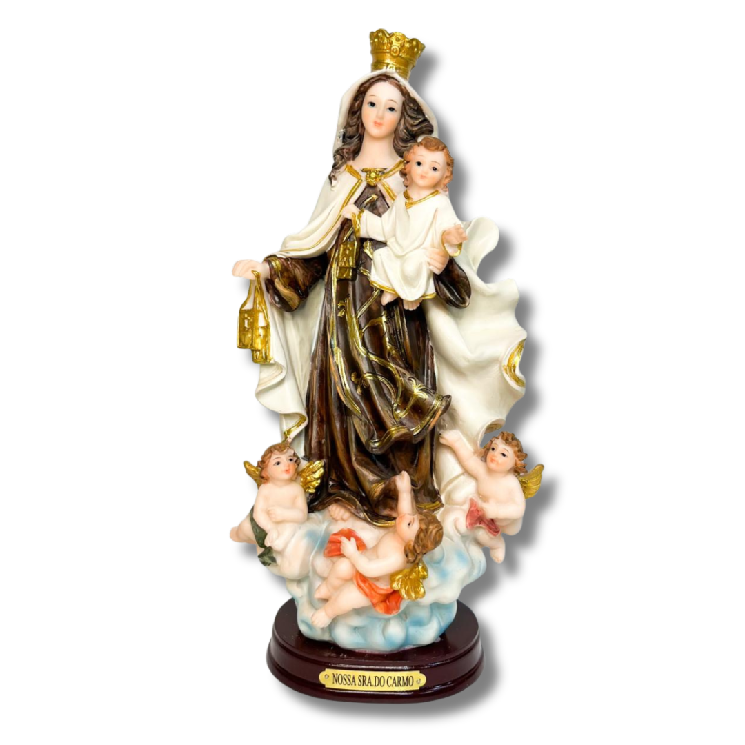 A Imagem de Resina de Nossa Senhora do Carmo, com 25 cm de altura, representa uma das mais antigas e queridas devoções marianas da Igreja, profundamente ligada à vida de oração, à confiança em Maria e à entrega a Deus.