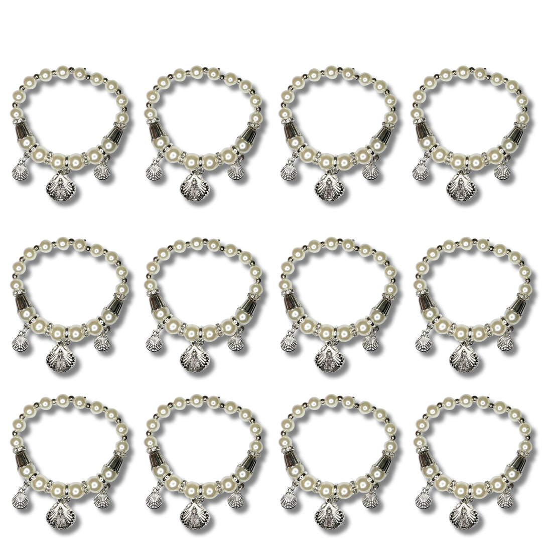 O Kit com 12 Pulseiras de Miçanga Perolada Branca com Medalha de Nossa Senhora Aparecida com Detalhe em Concha é um acessório religioso delicado e cheio de significado, ideal para expressar a devoção mariana com simplicidade e beleza.