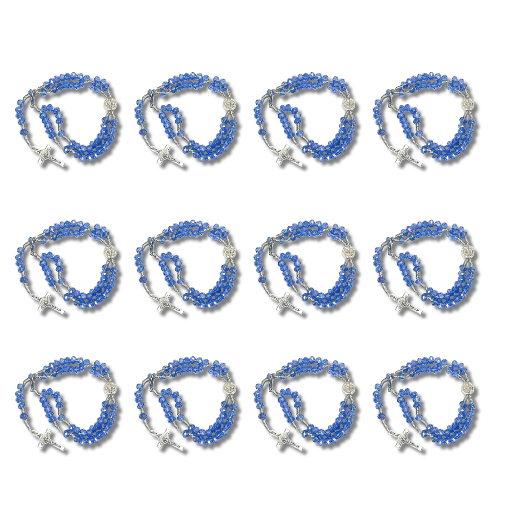 💙 Kit com 12 Terço de Pulso de Cristal Azul com Medalha de São Bento - Atacado (22 CM)