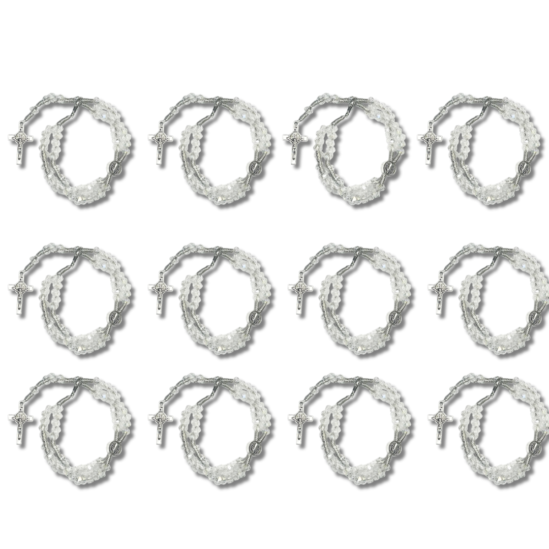 🤍 Kit com 12 Terço de Pulso de Cristal Branco com Medalha de São Bento - Atacado