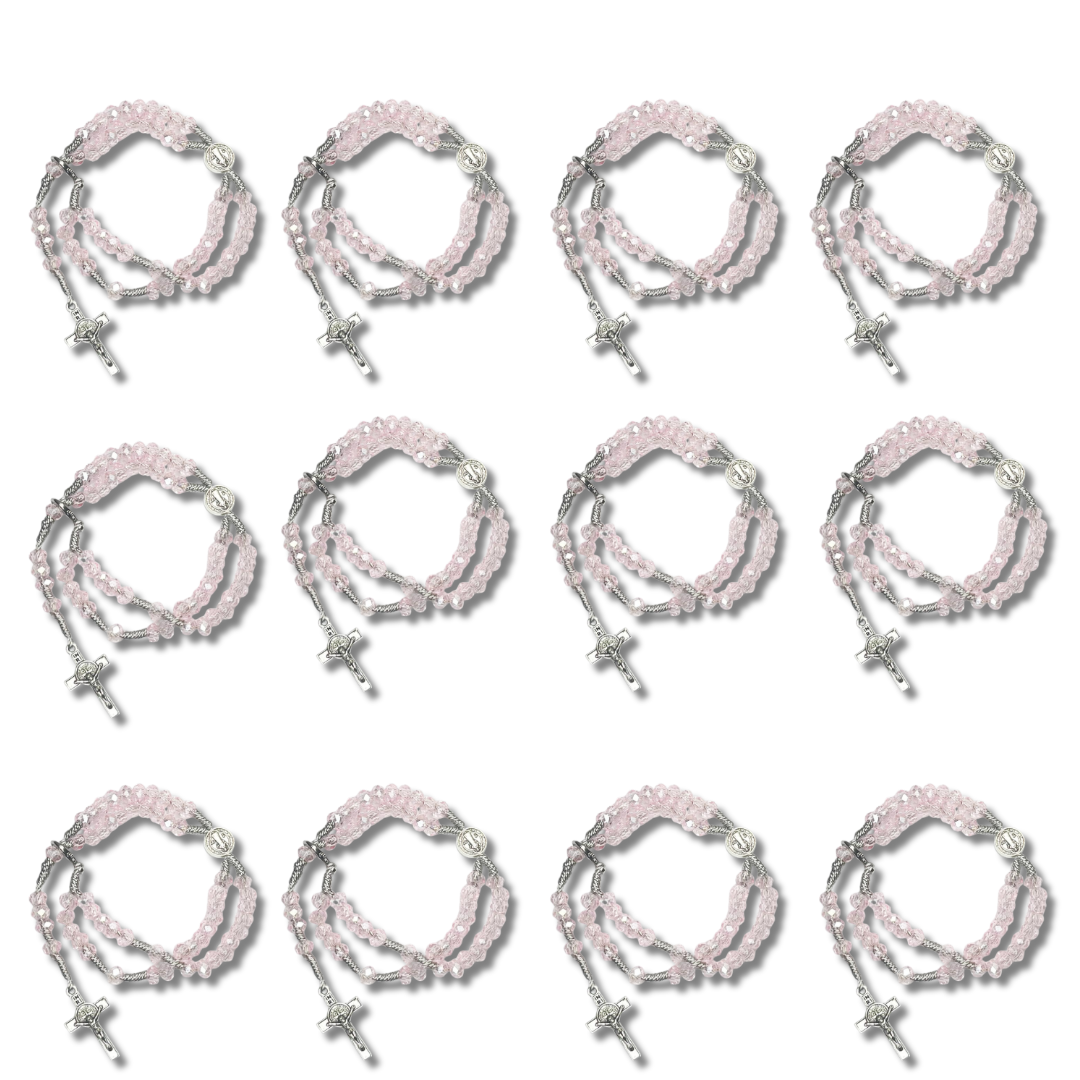 🌸 Kit com 12 Terço de Pulso de Cristal Rosa com Medalha de São Bento - Atacado