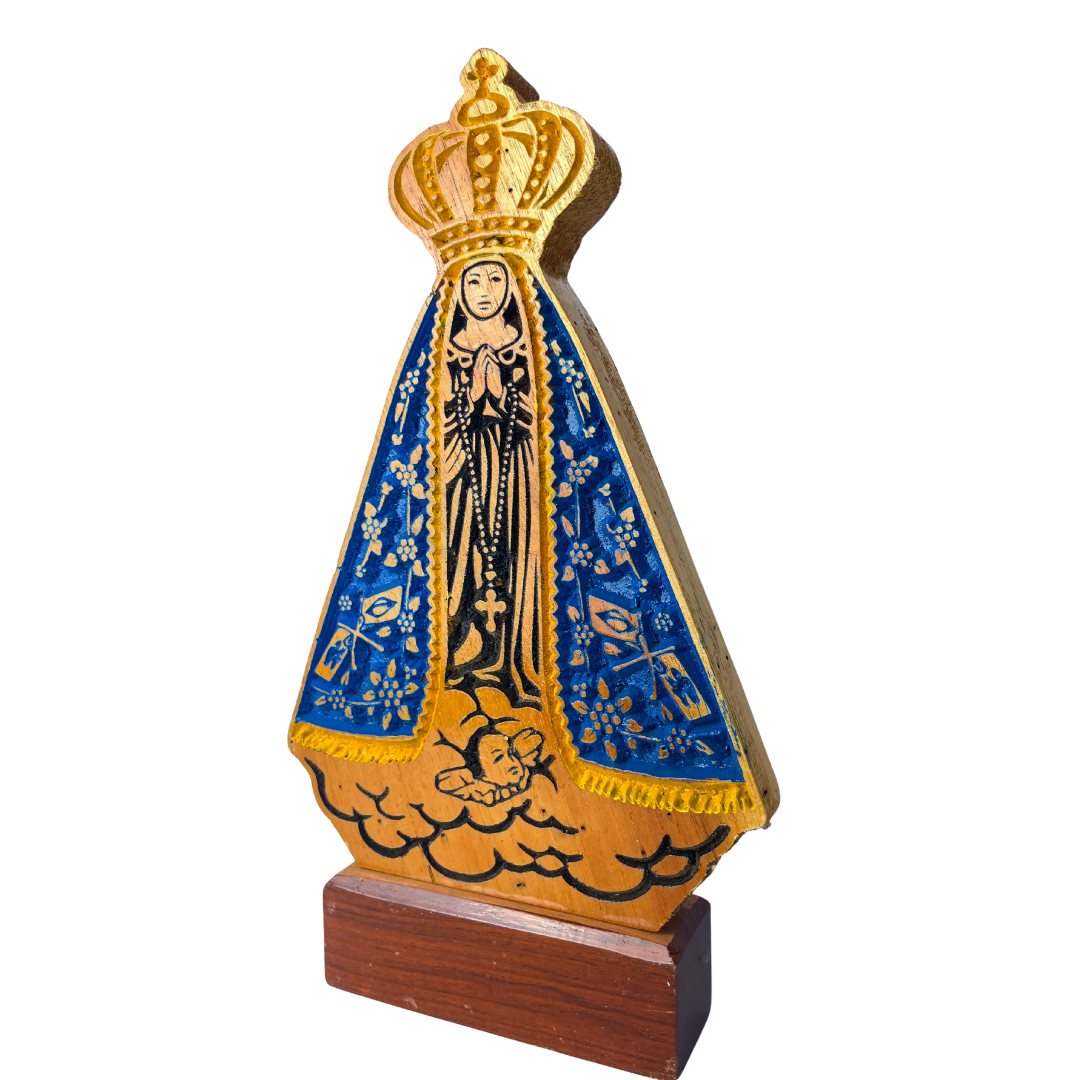 🌟 Esta escultura representa a Rainha e Padroeira do Brasil, Nossa Senhora Aparecida, invocada por milhões de fiéis como intercessora poderosa em momentos de necessidade. Sua imagem, encontrada milagrosamente nas águas do Rio Paraíba do Sul em 1717, é hoje um dos maiores símbolos da fé católica em nosso país.