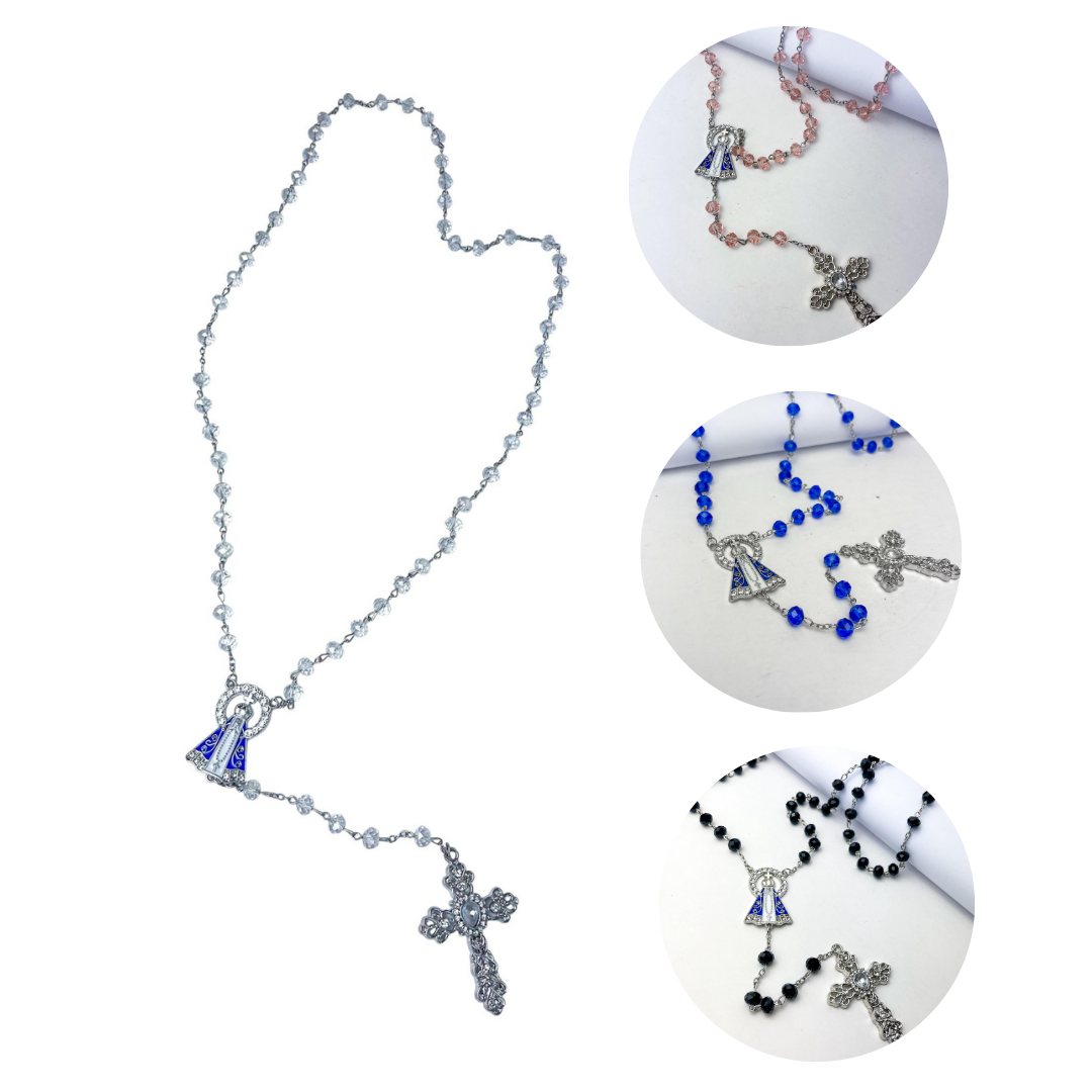 O Terço de Nossa Senhora Aparecida com cristais transparentes e detalhes em prata e azul é muito mais que um acessório religioso — é um símbolo de fé, proteção e beleza. Com 45 cm de comprimento, ele é ideal para momentos de oração, meditação ou como item de decoração sagrada no seu lar. Cada detalhe reflete devoção e cuidado, tornando-o um presente especial ou um companheiro diário para sua vida espiritual.