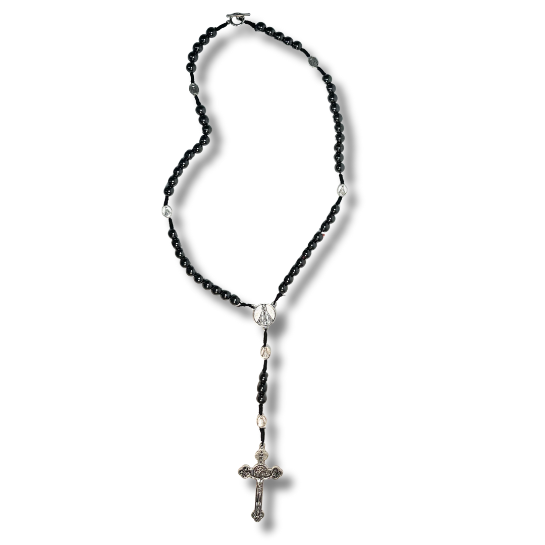 Terço de Nossa Senhora Aparecida em Hematita com Fecho T – Devoção e praticidade em um só acessório